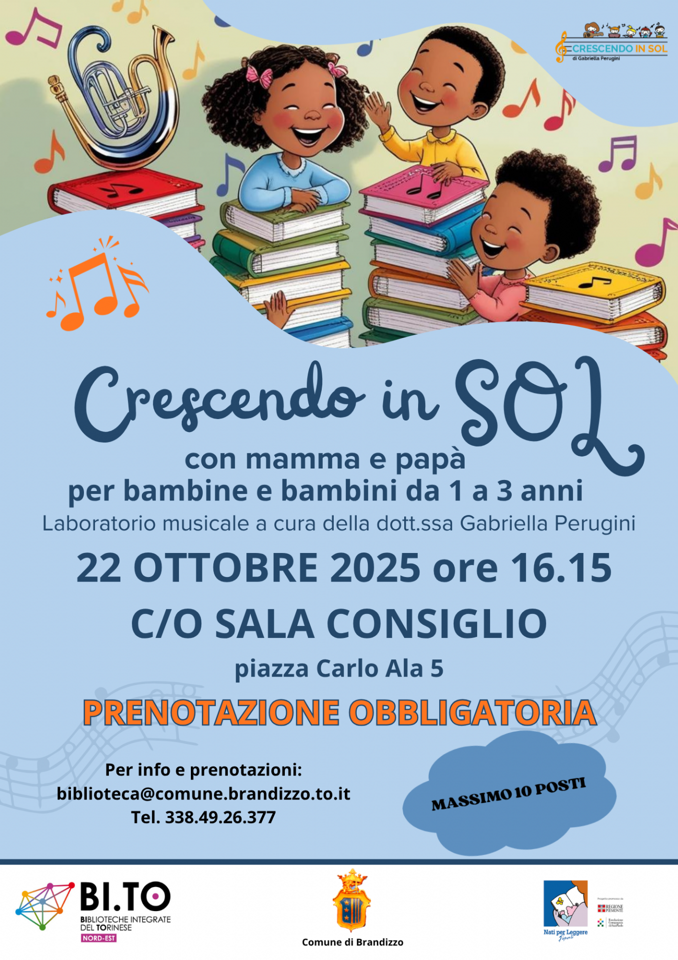 Nell'ambito delle iniziative del progetto Nati per Leggere, mercoledì 22 ottobre alle ore 16.15, presso la Sala del Consiglio di Brandizzo (piazza Carlo Ala 5), si svolgerà un giocoso laboratorio musicale a cura della dott.ssa Gabriella Perugini, liutista e chitarrista.