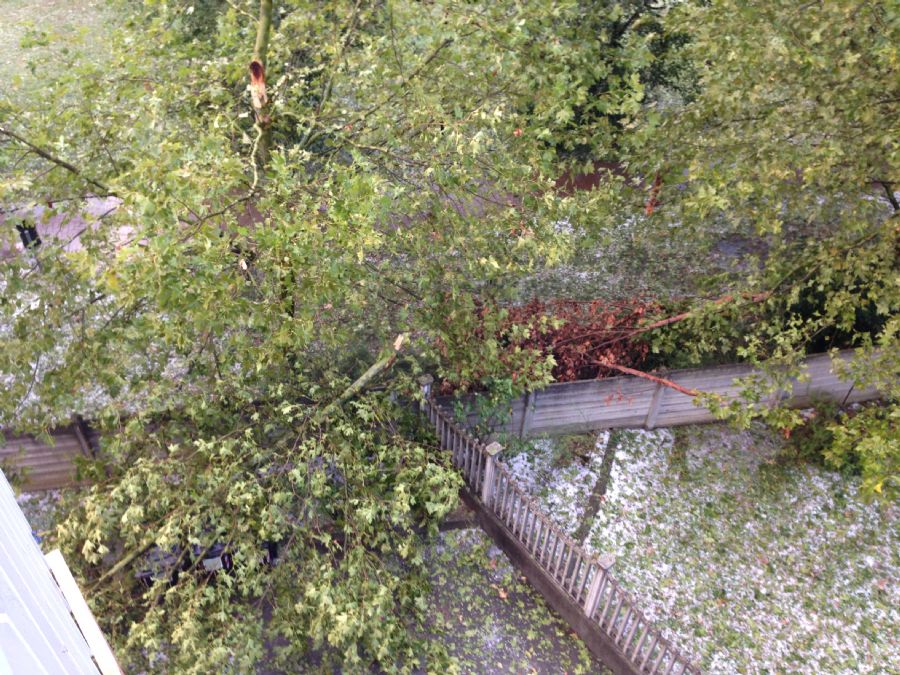 Via Dante Di Nanni 30-32. Si segnala che il nubifragio di questa sera (09/08/2017) ha causato la caduta di un albero dell'area parco lato cortile condominiale numeri civici 30-32 e che ostruisce parte del cortile stesso impedendo l'uscita dal box auto e l'utilizzo e la movimentazione dei cassonetti dei rifiuti. Si segnala inoltre che il temporale avvenuto ai primi di luglio ha provocato la rottura di due grossi rami caduti a ridosso della recinzione del condominio relativo ai numeri civici 26-28 di Via Dante Di Nanni. Si richiede di intervenire con sollecitudine. Grazie - Franco Palazzini