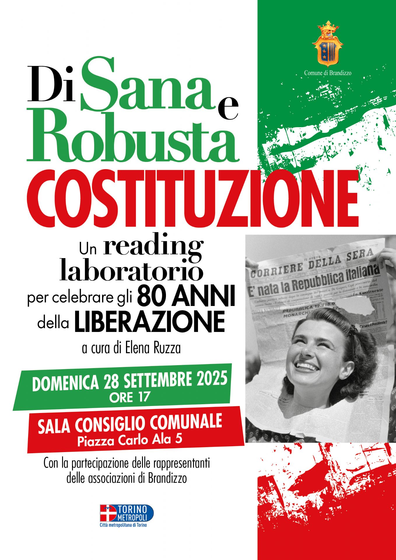 Nell'ambito del programma di iniziative volte a celebrare l'anniversario per gli 80 anni della Liberazione, si terrà, domenica 28 settembre alle ore 17.00, presso la Sala del Consiglio Comunale (piazza Carlo Ala 5), "Di Sana e Robusta Costituzione", un reading laboratorio a cura di Elena Ruzza e con la partecipazione delle rappresentanti delle associazioni di Brandizzo.