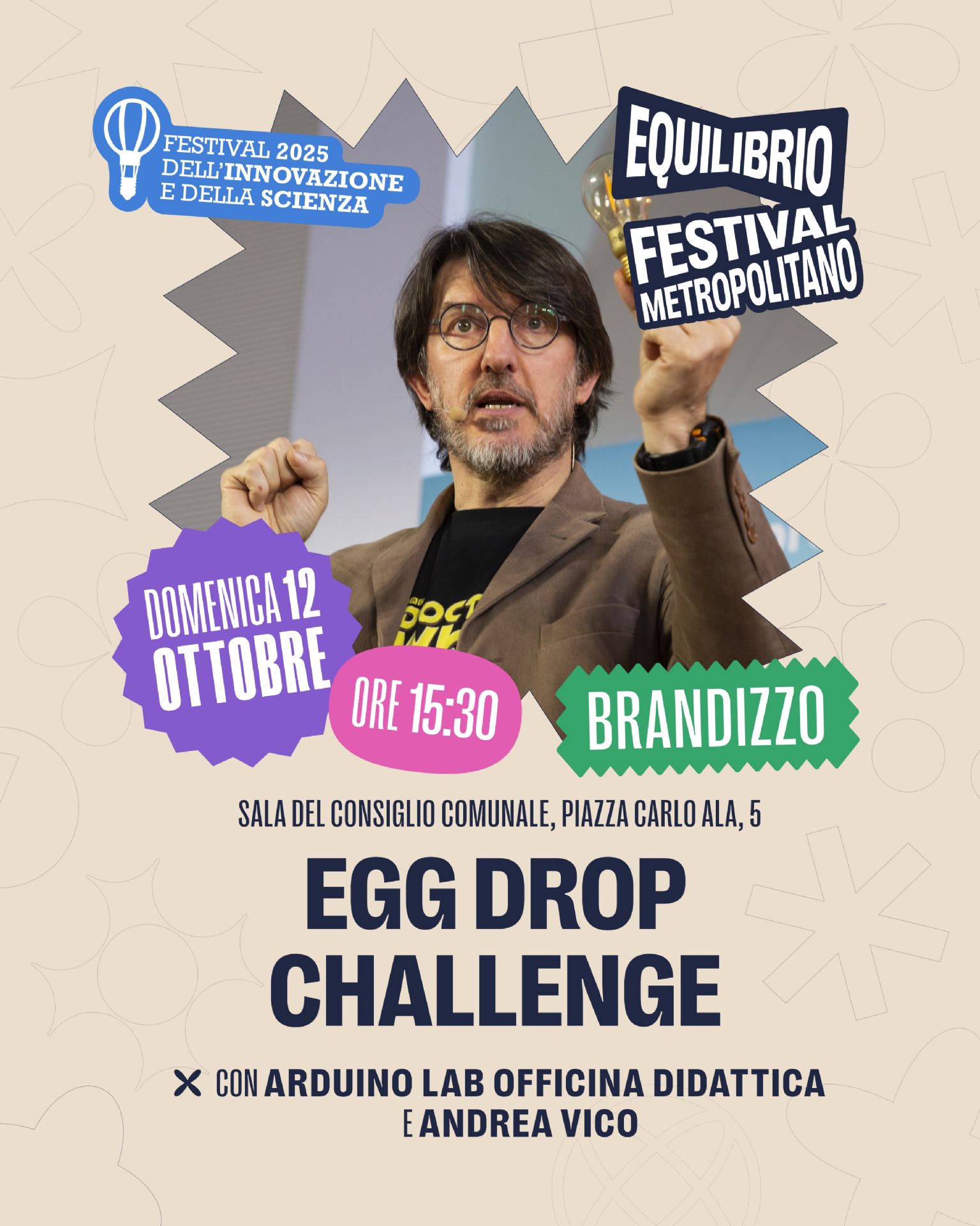 Nell’ambito della tredicesima edizione del Festival dell’Innovazione e della Scienza, domenica 12 ottobre alle ore 15.30, si svolgerà, presso la Sala del Consiglio Comunale (piazza Carlo Ala 5), Egg Drop Challenge, un contest emozionante basato sulle STEM che mette in equilibrio diverse abilità: fisica e spirito di gruppo, ingegneria, arte, problem-solving e sostenibilità per usare al meglio le risorse. Vincerà la Egg Drop Challenge la squadra che in 90 minuti di tempo saprà progettare e realizzare la strategia migliore per lanciare un uovo crudo da 5-6 metri di altezza e farlo atterrare senza scalfirlo.