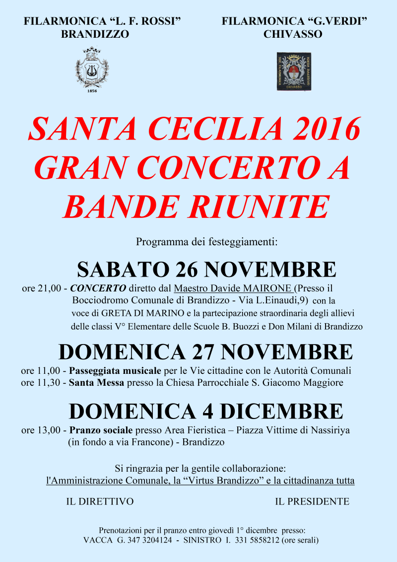 La Filarmonica "L.F. Rossi" di Brandizzo e la Filarmonica "G. Verdi" di Chivasso, organizzano congiuntamente alcune inizitive in occasione della ricorrenza di Santa Cecilia.