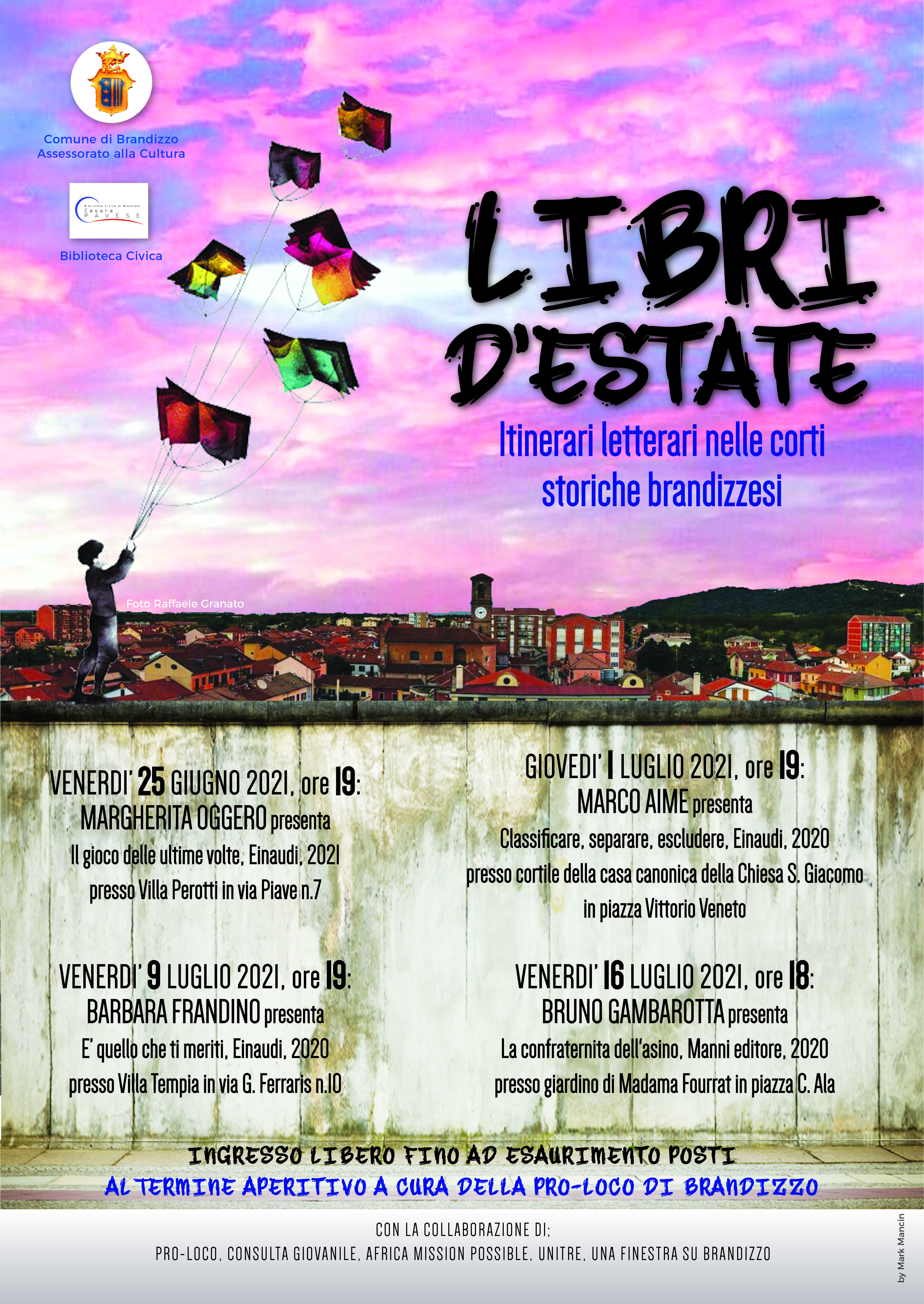 Venerdì 25 giugno 2021 prenderà il via la rassegna "Libri d'estate. Itinerari letterari nelle corti storiche brandizzesi". Si tratta di quattro incontri con affermati autori del panorama nazionale - Margherita Oggero, Marco Aime, Barbara Frandino e Bruno Gambarotta - che presenteranno le loro più recenti opere in altrettante corti di Brandizzo, scelte per il notevole interesse storico-culturale. L'evento, il primo in presenza dopo il lungo stop causato dalla pandemia, è organizzato dall'Assessorato alla Cultura del Comune di Brandizzo in collaborazione con Unitre, Pro Loco, Consulta giovanile e le associazioni Africa Mission Possible e Una Finestra su Brandizzo. Al termine di ogni incontro, ai presenti sarà offerto un aperitivo, a cura della Pro Loco brandizzese.