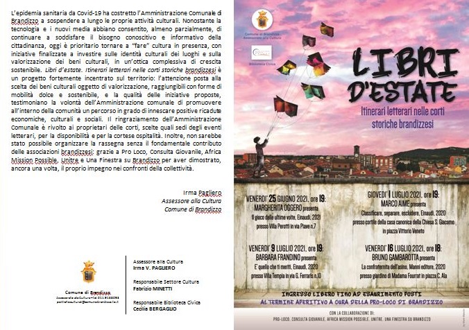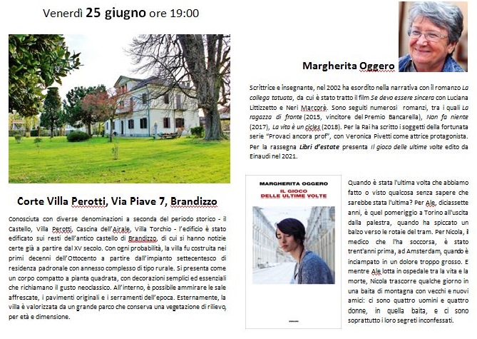 Prenderà il via il prossimo venerdì 25 giugno, alle ore 19, la rassegna Libri d'estate. Itinerari letterari nelle corti storiche brandizzesi. Il primo appuntamento è con la scrittrice Margherita Oggero, che presenterà il suo Il gioco delle ultime volte (Einaudi, 2021). La presentazione si svolgerà nella splendida corte di Villa Perotti, sita a Brandizzo in Via Piave numero 7.