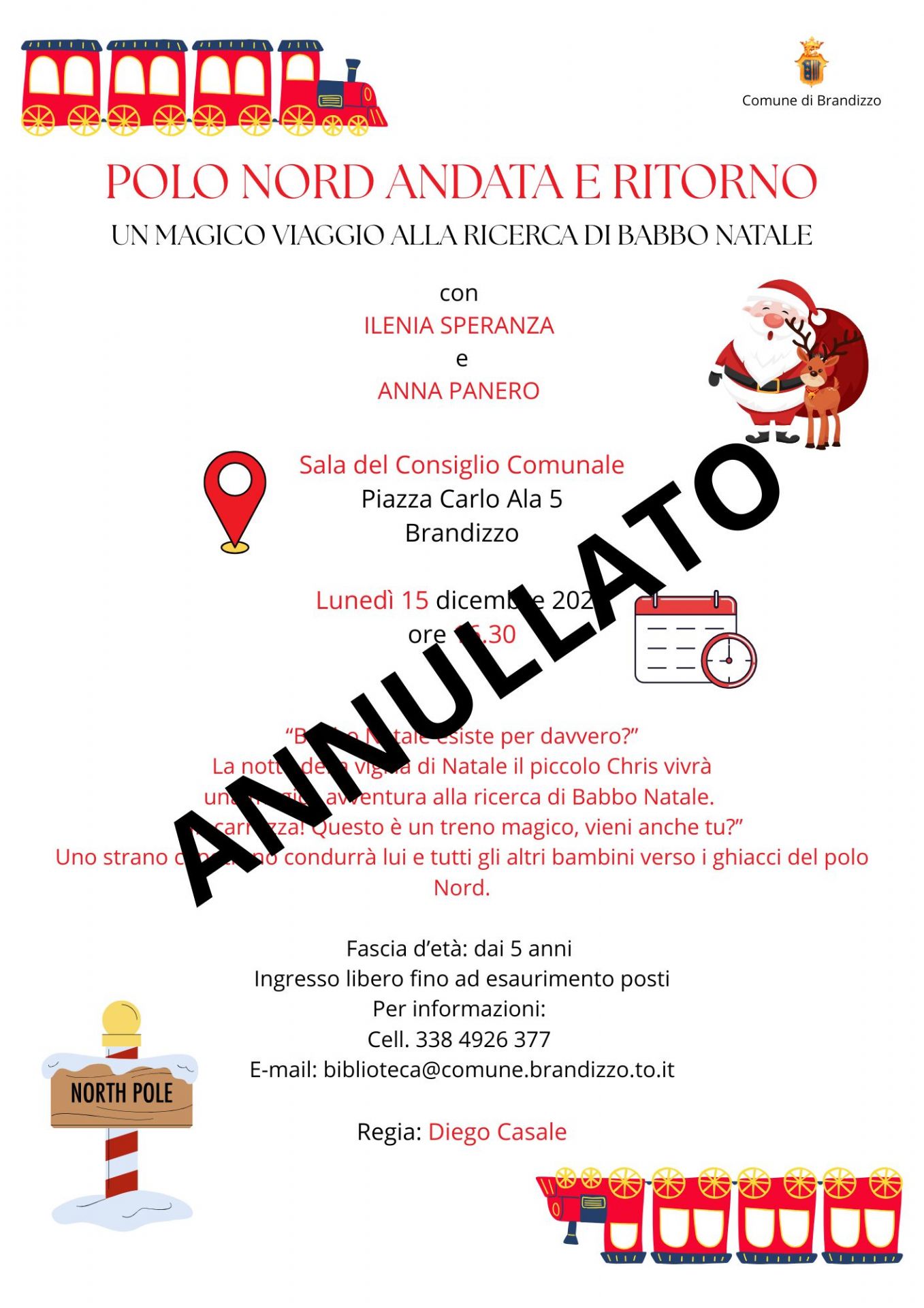 Si avvisano gli utenti che lo spettacolo "Polo nord andata e ritorno: un magico viaggio alla ricerca di Babbo Natale" previsto per lunedì 15 dicembre 2025, alle ore 16.30, presso la Sala Consiglio di Piazza Carlo Ala 5 a Brandizzo è stato annullato causa impedimento delle attrici.