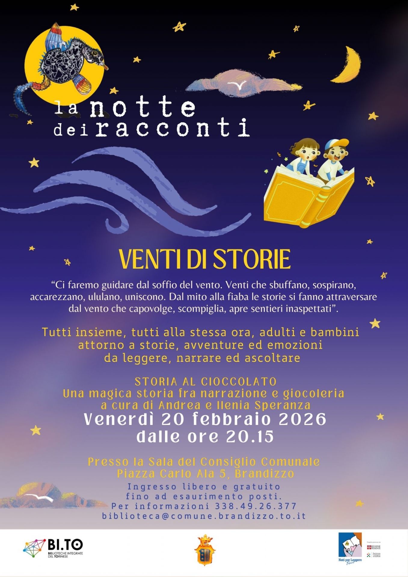 La nostra Biblioteca Civica "Cesare Pavese", insieme con quelle del sistema bibliotecario BI.TO, risponde all'invito e attende i bambini e le bambine di Brandizzo e le loro famiglie, venerdì 20 febbraio 2026,alle ore 20.15, presso la Sala del Consiglio Comunale (piazza Carlo Ala 5), per assistere ad una magica storia tra narrazione e giocoleria, intitolata “Storia al Cioccolato”, a cura dei professionisti Andrea e Ilenia Speranza.
