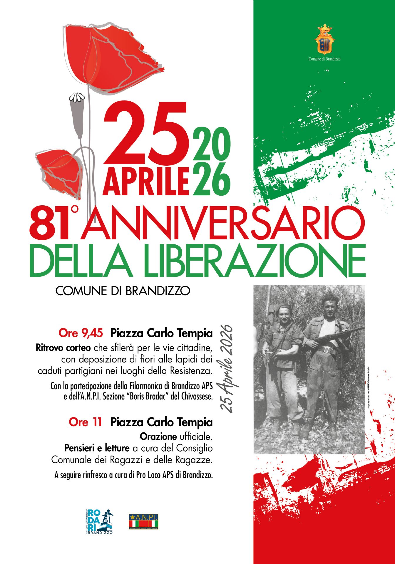 Sabato 25 aprile 2026 ricorre l'ottantunesimo anniversario della Liberazione d'Italia. Per commemorare la liberazione dall'occupazione nazista e dal fascismo, l'Amministrazione Comunale di Brandizzo invita le associazioni e la cittadinanza tutta a prendere parte al programma istituzionale di celebrazioni, che prevede il ritrovo del corteo alle ore 9.45 presso Piazza Tempia. A seguire, si sfilerà per le vie cittadine, rendendo omaggio ai luoghi della Resistenza e ai partigiani caduti. Alle ore 11.00, presso Piazza Tempia, si svolgerà l'orazione ufficiale e i componenti del Consiglio Comunale dei Ragazzi e delle Ragazze daranno voce a pensieri e parole dedicati alla Liberazione del nostro Paese.