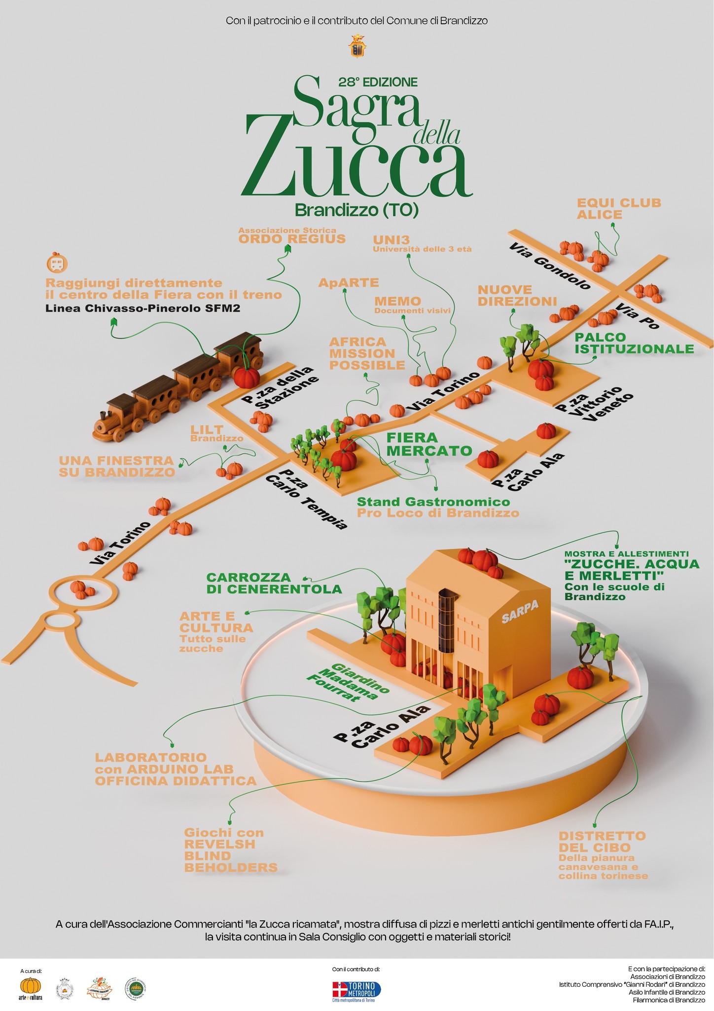 La Sagra della Zucca, che da sempre si contraddistingue per la qualità dei produttori presenti e per il forte legame con la tradizione del territorio brandizzese, torna con un’edizione davvero speciale, grazie anche alla collaborazione dei numerosi partners: oltre all’associazione Brandizzo Arte e Cultura Aps e all’Amministrazione Comunale, hanno collaborato per la 28 edizione la Pro Loco di Brandizzo, l’Associazione Commercianti, il Distretto del cibo della Pianura canavesana della collina torinese, l’Istituto Comprensivo “G. Rodari” di Brandizzo e l’Asilo infantile Brandizzo. La manifestazione ha ricevuto inoltre il sostegno della Città Metropolitana di Torino.