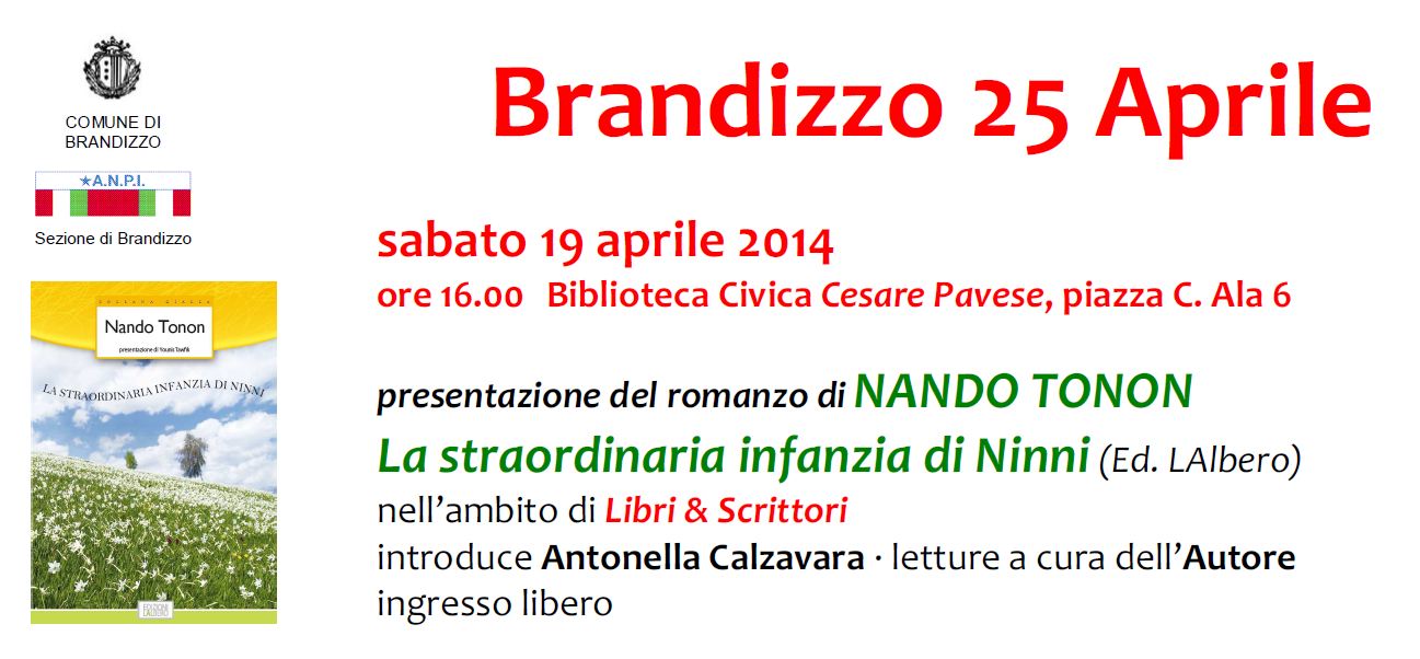 Nella ricorrenza dell'Anniversario della Liberazione e nell’ambito di "Libri & Scrittori", sabato 19 aprile, ore 16.00, presso la "Biblioteca Civica Cesare Pavese" (piazza C. Ala 6 - Centro Culturale "Sarpa"), presentazione del romanzo "La straordinaria infanzia di Ninni" (Ed. LAlbero) di Nando Tonon.